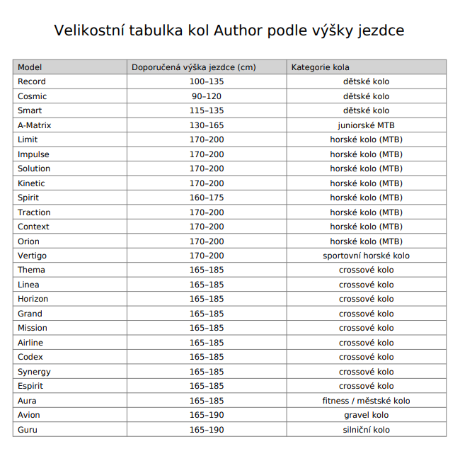 Tabulka velikostí Author 2026